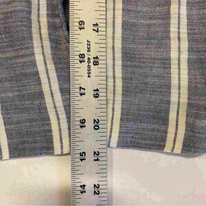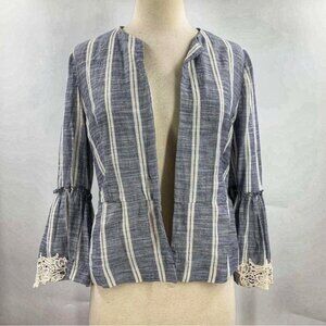 Stylish blazer with blue and white stripes. Features flared sleeves with lace trim. Open front design.