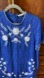 Vibrant blue dress with white floral embroidery. Short sleeves and round neckline. Mini style with easy fit. Linen.