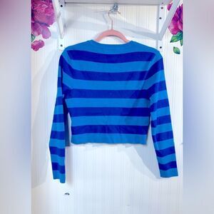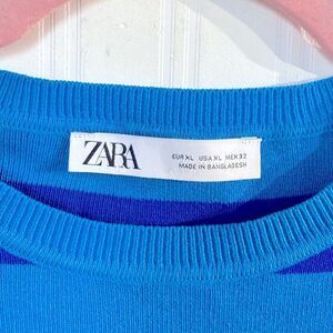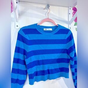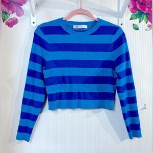 This stylish crop top from Zara features a fitted design with long sleeves, perfect for a chic and modern look. The alternating shades of blue stripes add a vibrant touch, while the crew neckline and snug knit fabric ensure a comfortable fit.