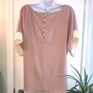 Zara blush pink and cream two toned top, round neckline, full sleeves, beautiful 5 button closure on back, hi-low hemline, side slits, fits loose, lightweight flowy fabric, 100% poly, in great used condition, no flaws.