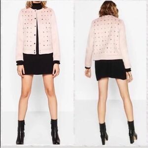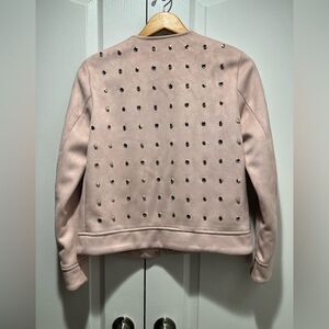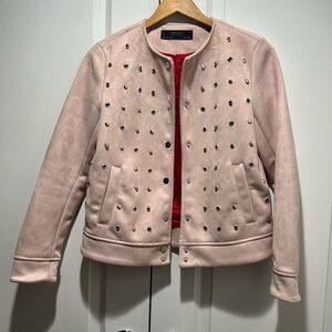 Condition: Excellent. No holes noted inside - see last picture. Please review photos as they are the best representation of the actual item. *Style: 6318 222 620 *Suede-effect fabric *Studded Detail *Long Sleeve *Collarless Round Neckline *Snap Up *2 front pockets *Shoulder pads: No *Shell: 100% Polyester *Lining: 100% Polyester *Care: Hand wash *Measurements are approx & taken lying flat with jacket snapped *Shoulder To Wrist: 24” *Bust: 38” *Shoulder to hem: 21.5” *Across back shoulder seams: 16”