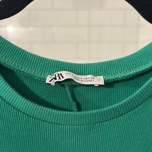 Never worn - too small. Fits more like an XS. Sleeveless knit dress with ruffle shoulder detail. Solid green color. Soft, stretchy fabric with a flattering A-line silhouette. Easy, polished look for day or evening.