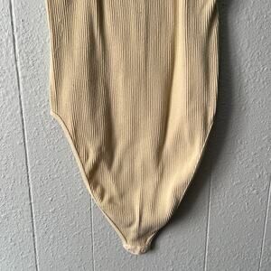 Zara women's bodysuit in butter yellow. Round neck. Sleeveless. Racerback. Ribbed. Stretch. Snap button closure. In good used condition. No stains, tears or holes.