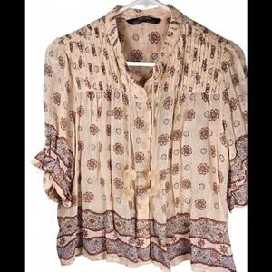 Elevate your wardrobe with this gorgeous chic bohemian floral blouse from Zara's Premium Denim Collection. Perfect for casual outings and warm weather. Crafted from lightweight fabric, it features a beautiful mix of floral patterns and earthy tones. The pleated design and softly rolled sleeves add a stylish touch, while the drawstring with decorative tassels offers versatility in styling. Pair it with jeans or shorts for a relaxed look. This blouse is not only comfortable but also a statement piece that reflects your unique style.