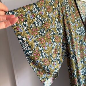 Lightweight and flowing short dress or tunic top in a pretty floral print with black trim. Raglan kimono style sleeves and short slits at sides near bottom hem. Pattern has a mix of green, gold, teal, burgundy, black and periwinkle colors. Perfect for warm summer days- transitions to fall with sweaters, cardigans, and boots. Looks great as a tonic over linen pants or jeans. Has a boho look in a comfortable looser fit.