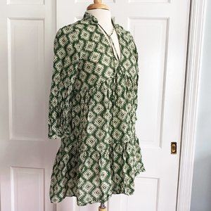 Great pre-owned condition! 100% cotton. Flowy, gathered tiers. 3/4 gathered sleeves. Deep V neck with ties. Midtone green with ivory print.