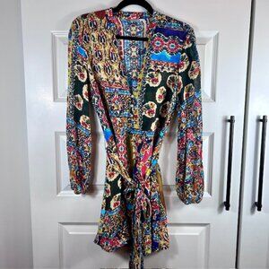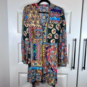 Zara Boho Patchwork Print Long Sleeve Tie Waist Mini Dress Medium