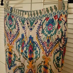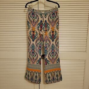 Zara boho patterned lightweight pants women's medium, Zara summer flare pants multicolor print, lightweight bohemian print festival pants Zara, Zara women's relaxed fit summer pants medium, colorful tribal print flare pants women's, Zara elastic waist lightweight boho pants, patterned flare festival pants Zara women's medium, vibrant multicolor summer pants for women, Zara casual bohemian patterned pants medium