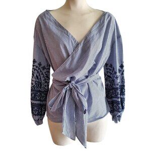 Zara Boho Striped Wrap Top Embroidered Bishop Sleeve Size M