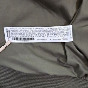 For sale, this designer Zara bomber jacket. The olive-green jacket features a stand-up collar, full zip closure, and elastic waist for a comfortable fit. With five pockets, you can easily carry your essentials while walking or hiking in the fall and winter seasons.