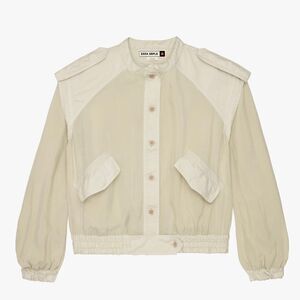 Bomber made of cupro. Round neck and long sleeves and elastic cuffs. Flap pockets at front. Epaulettes and mixed fabric detail. Elastic hem. Front button closure.