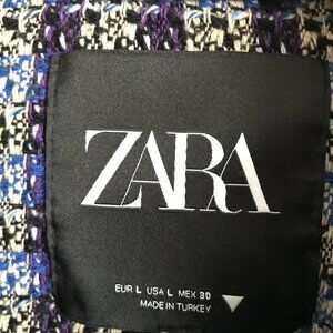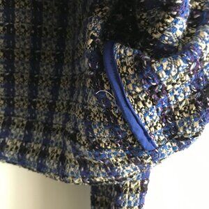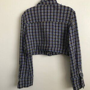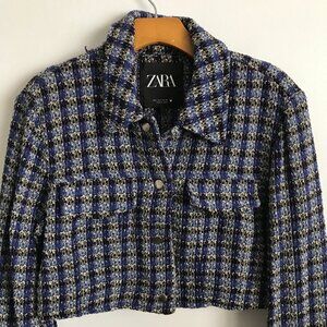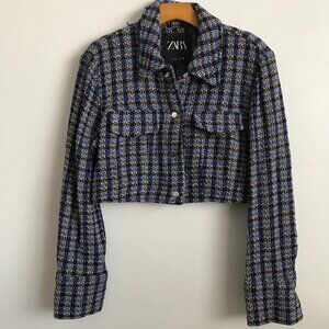 Zara Boucle Blue Check Crop Tweed Snap Button Jacket Womens L