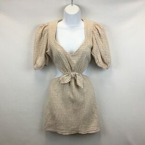 Zara Bow Front Cut Out Puff Sleeve Dress Tan. Sweetheart neckline. Bow at waist. Cut out back and side. Puff sleeves with elastic cuff. Pink and green grid pattern. Linen blend. Crinkle fabric. Size XS.
