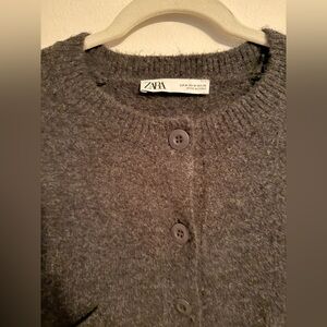 Chic dark gray cardigan from Zara. Features button-up front and pocket details. Ideal for layering.