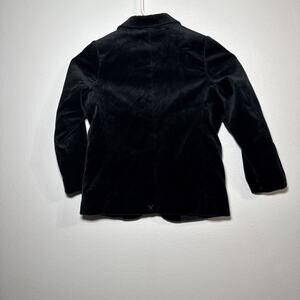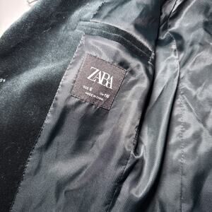 The Zara Boys Velvet Suit Jacket Blazer in green, size 6, is a stylish and formal addition to any young boy's wardrobe. Made from luxurious velvet fabric, this blazer features a classic one-button front closure and a notch lapel. The lined jacket is perfect for special occasions, such as Christmas, and can be machine washed for easy care. With its solid pattern and long sleeves, this blazer is ideal for the winter, fall, and spring seasons, adding a touch of sophistication to any outfit.
