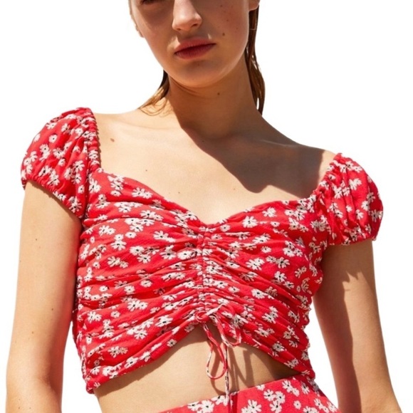 ~featuring a bright pink hue with floral design and smocked back, cropped