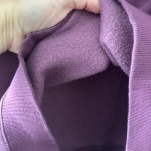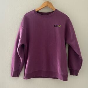 Solid purple crewneck with a drop hem on back. EGH embroidered with a bee in neon yellow.