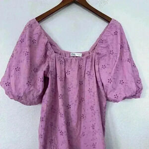 This stunning Zara mini dress in size M is perfect for any casual occasion. The dress boasts a beautiful floral pattern with a square neckline and half puff sleeves. The pullover closure adds convenience to the design. Made with a lightweight cotton blend material, the dress is perfect for summer, fall and spring seasons. The dress length is short, and the ruffle and embroidered accents add a bohemian and classic vibe to the shift style. The dress is fully lined and not handmade. The dress is perfect for brunch and other occasions, and the pink color adds a touch of elegance to your outfit.