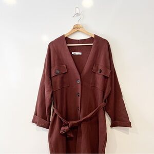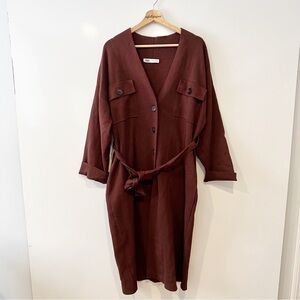 Zara Brown Knit Coat with Belt, V-neck collar, long sleeves, two breast pockets with button closure, front button closure.