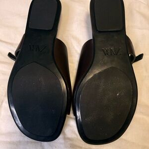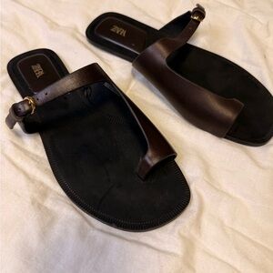 Stylish brown leather sandals by Zara. Features a sleek design with a buckle strap.