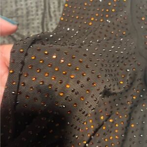 Elegant brown top with shimmering gold accents. Features a draped neckline and long sleeves. Perfect for evening wear.