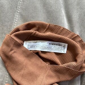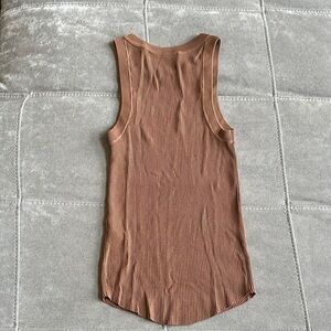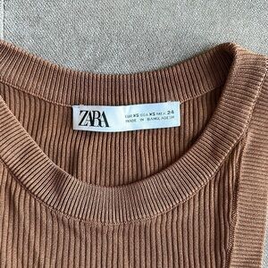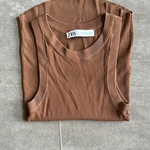 This Zara tank top showcases a fitted silhouette with a ribbed texture in a warm brown shade. Its sleeveless design and rounded neckline offer a classic and versatile style. Made from soft ribbed knit material, it provides comfort and elegance for any occasion.