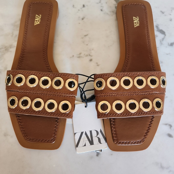 Step out in style with these chic Zara slide sandals. Featuring a rich brown color and eye-catching gold accents, these shoes are perfect for any occasion.