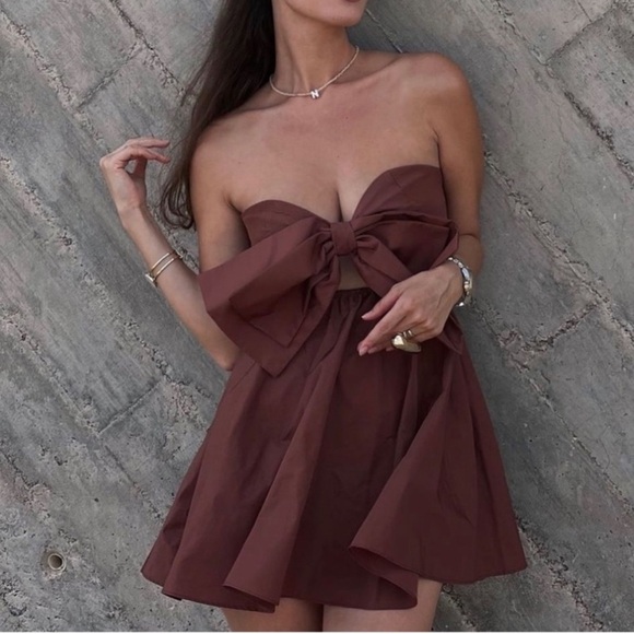 Elegant strapless dress with a large bow detail. Perfect for any occasion.