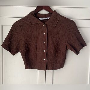 Zara Sz. XS Textured Collared Button Down Crop Shirt Blouse Top Brown