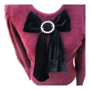 Make a statement in this fun, vintage-inspired, retro-glam schoolgirl burgundy fuzzy knit long-sleeve sweater with a black velvet bow and rhinestone brooch. This unique sweater combines a charming schoolgirl aesthetic with a touch of mobwife glamour, making it a versatile piece that is perfect for wherever your adventures take you!
