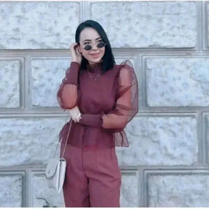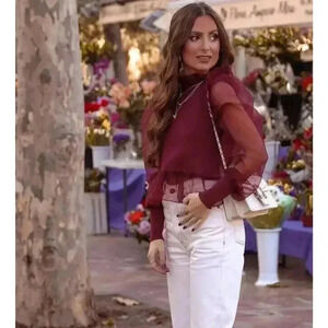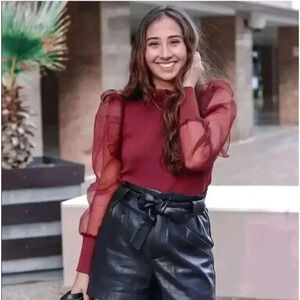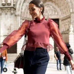 Zara Burgundy Chiffon Ruffle Organza Puff Sleeves Blouse Top Sz S blogge…