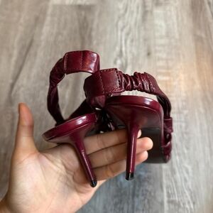 Heeled leather sandal. Straps on the front with bow detail. High stiletto heel. Back strap with adjustable elastic. Square toe.