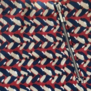 Mid-rise stretchy skinny pants with fake zipper front pockets and fake back pockets. Super comfy and perfect for work / business casual outfits. Paint strokes pattern in red, black and beige.