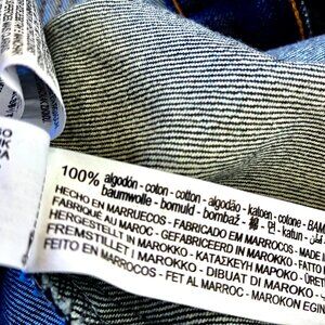 Zara dark blue wash denim jean jacket. Button front closure with Zara Denim logo incised on metal buttons. Chest pockets. Collared. Long Sleeves. Orange top-stitching. Two buttons on cuffs. Shirttail hem - drop hem in back.