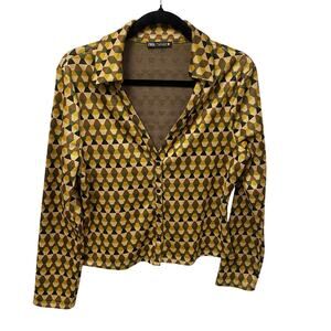 Zara Button Front Lowcut Collared Retro Geometric Print Knit Top Womens Large