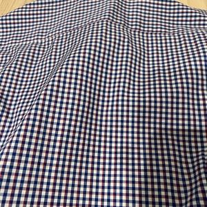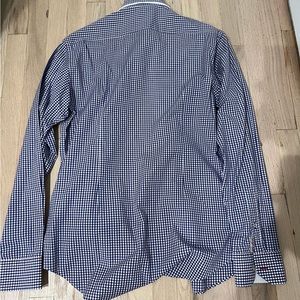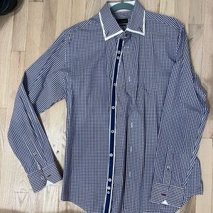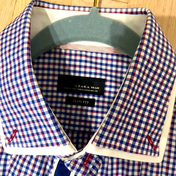 Very trendy blue and red patterned button down shirt. Slim fit size XL (fits more like a large). Has a double collar design with a blue/navy stripe down middle . Excellent condition.