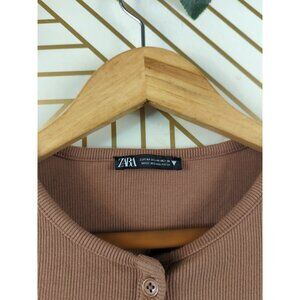 Zara Button-Up Ribbed Cropped Lightweight Cardigan Top Brown Tan Size MED