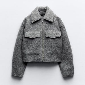 Jacket with lapel collar and long sleeves. Front patch pockets with flaps. Front metal zip