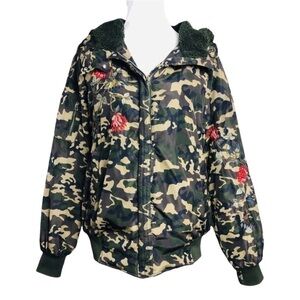 Zara Camo Jacket Green Floral Embroidered Quilted Bomber with Hood