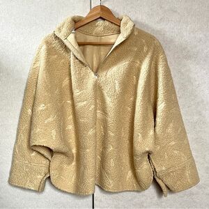 High Collar Top, Long Cape Sleeves, Tonal pressed embellishment, gold tone metallic zipper at the back, semi open side and dolman sleeve seams with cuff button