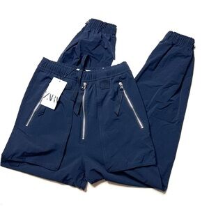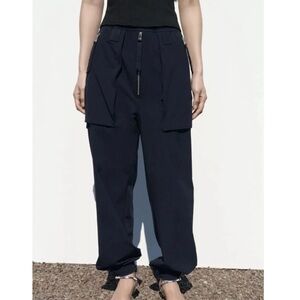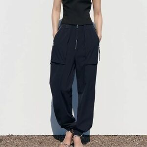 High waist trousers nade of cotton blend. Front pockets. patch zip pockets on the legs and welt pockets at the back. Tabs with snap buttons at the hem. Front zip fly, button, and metal hook fastening