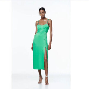 Zara Chain Strap Satin Effect Corset Style Midi Dress NWT Green Size Small