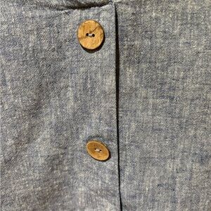 Zara women's chambray linen/cotton blend top with tie sleeves, a V-neck, and a button-down front. It features three wooden buttons and tie details at the ends of the sleeves. The top is made of a lightweight, textured fabric, light blue or chambray color. Good condition size XS. See measurements to insure proper fit for you thanks for looking!