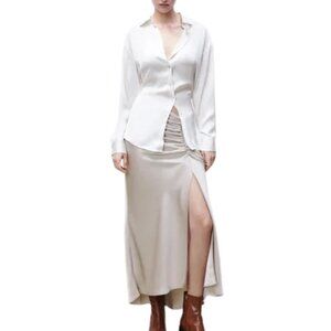 Zara Champagne Beige Ruched Satin-Effect Midi Skirt High Slit Bias Cut Sz Small