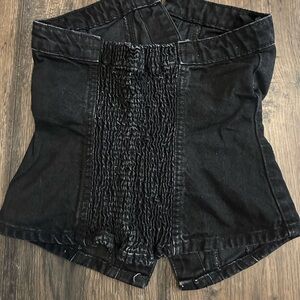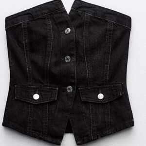 Chic charcoal denim vest with front buttons. Features sleek design and subtle pocket accents.