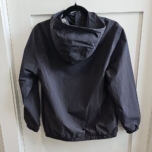 This stylish deep gray raincoat from Zara is designed with a hood and a full-length zipper, offering both functionality and fashion. Made from a water-resistant synthetic fabric, it ensures you stay dry during rainy days. The relaxed fit and elastic cuffs provide comfort and ease of movement.