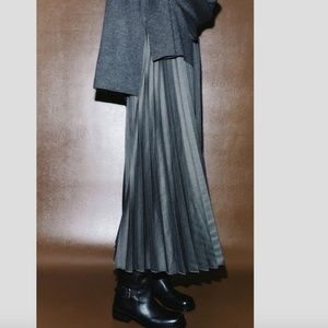 Chic charcoal maxi skirt. Features elegant pleats. Ideal for versatile styling.