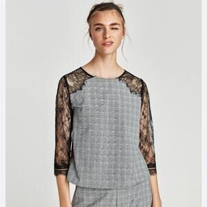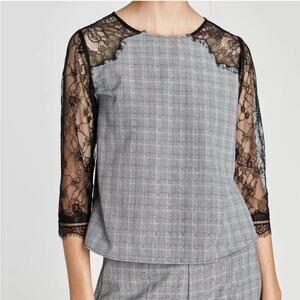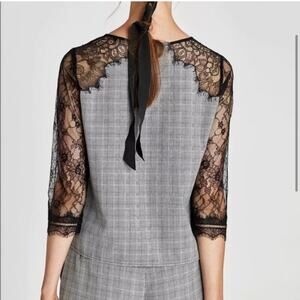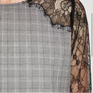 Features glen plaid fabric and lace material on shoulders and sleeves