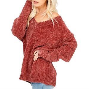 Zara Chenille Chunky Knit Oversized V-neck Cozy Pullover Sweater Rust Spiced Red