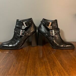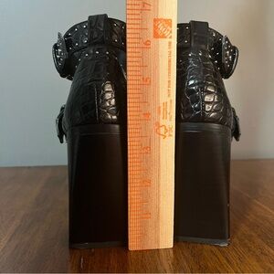 Very good preowned condition. Gently worn. Women’s size 7.5. Stylish black boots with croc-embossed texture. Features silver buckle and stud details. Perfect for a bold fashion statement.